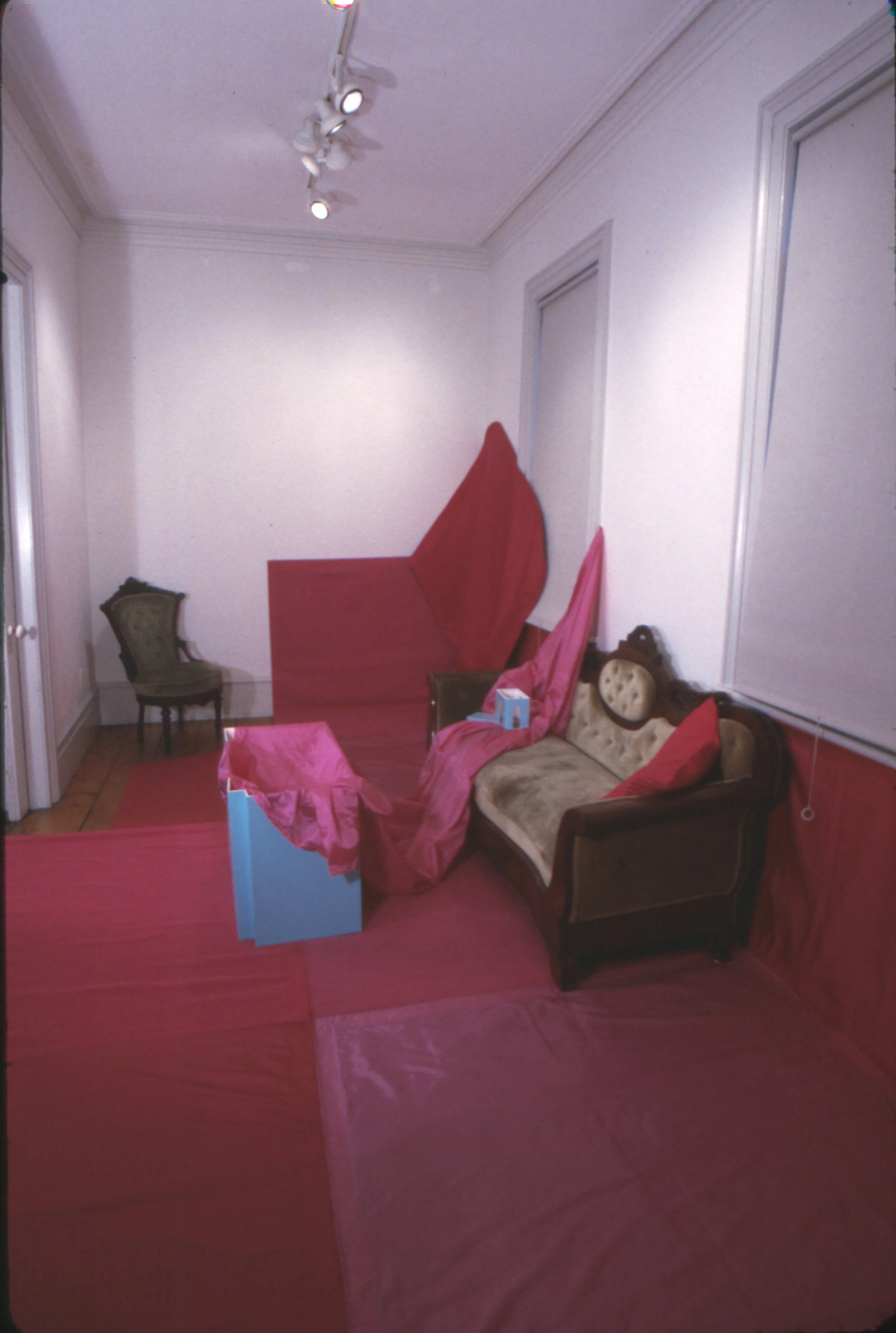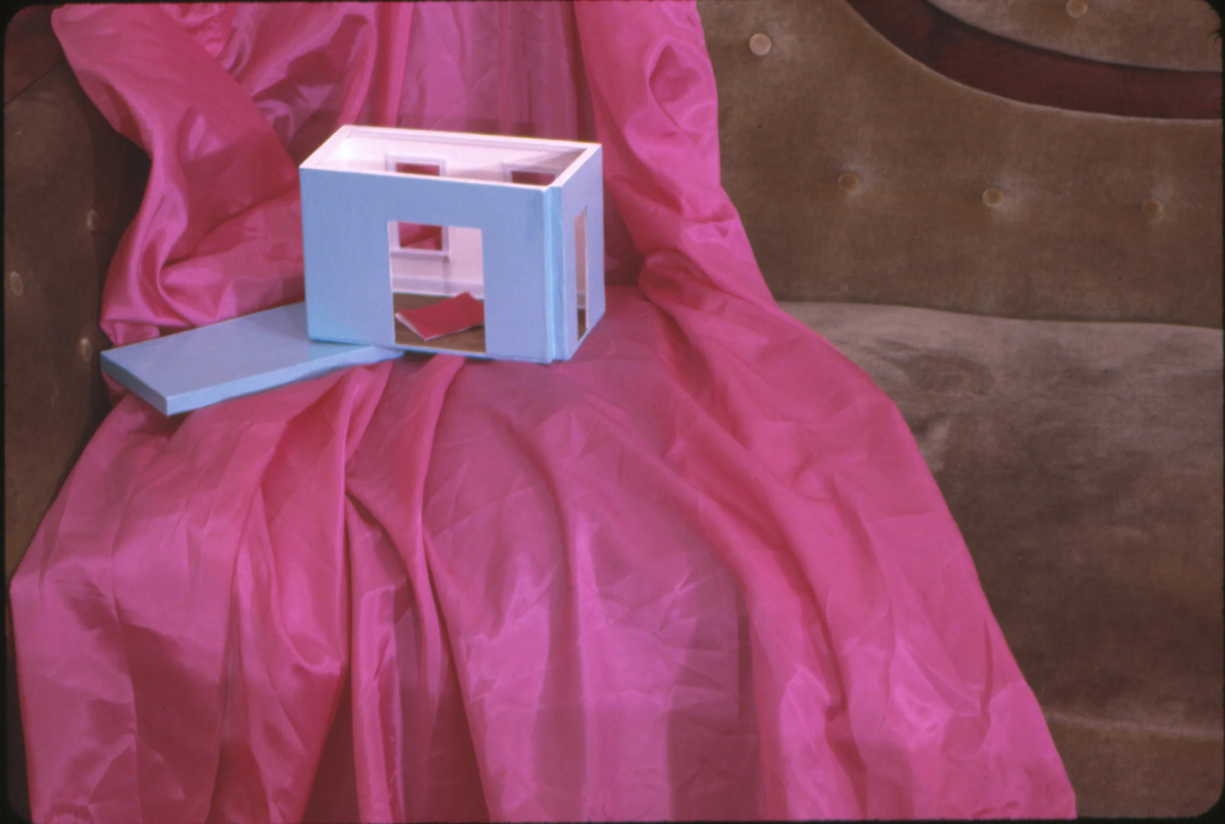 Another box, sits in the center of the room, a smaller scale of the room itself. Pink fabric spills out onto the couch, where another box sits, lid uncovered, revealing yet a smaller scale model of the room itself.