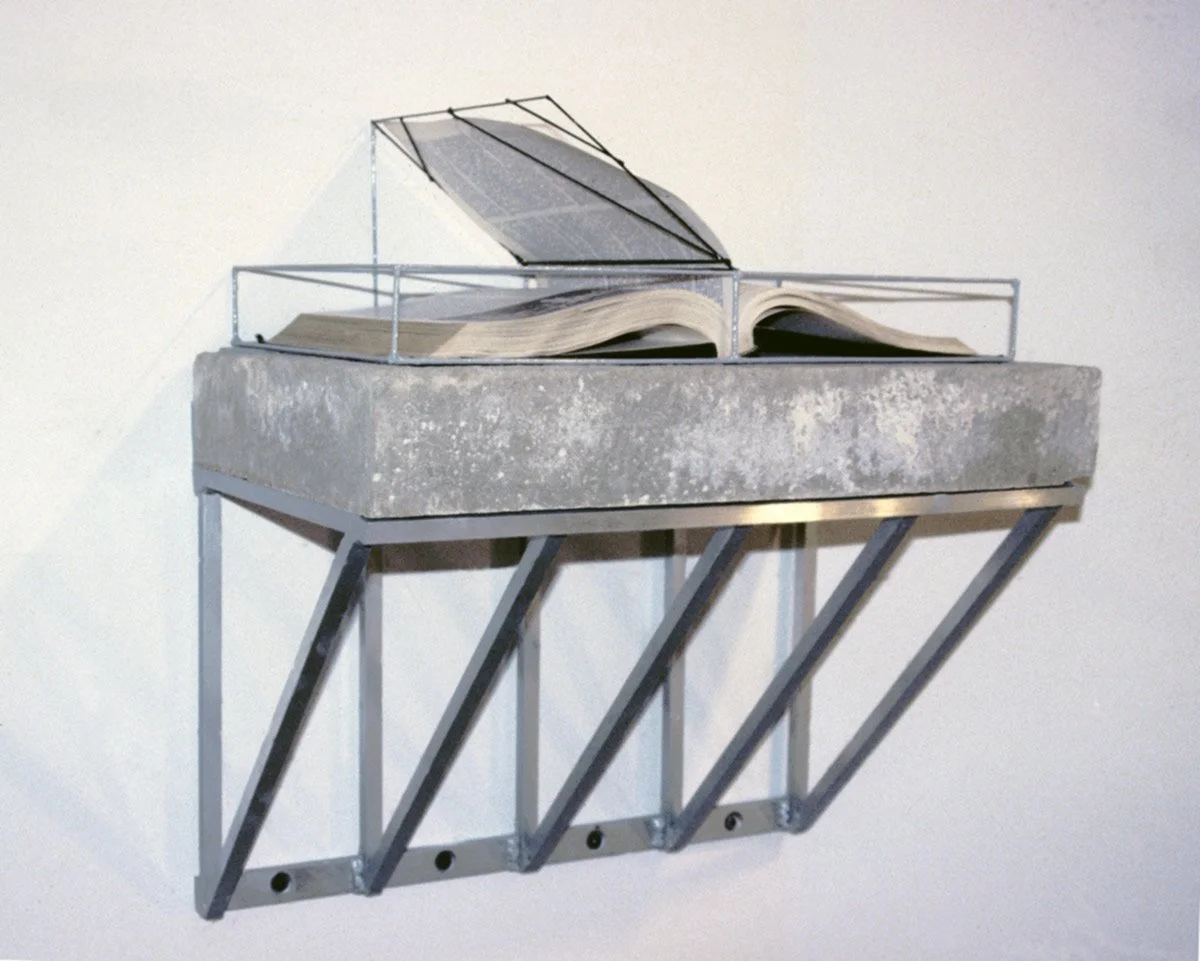 A set of Encyclopedias sits high on a concrete slab on the wall. Individual pages in different stages of movement are held up by steel scaffolding on top of a concrete footing, pointing to the direction of a construction site of boxes making up a floor plan made of folded pages.