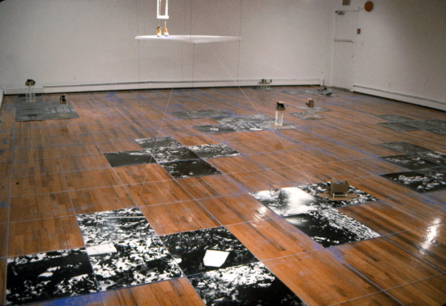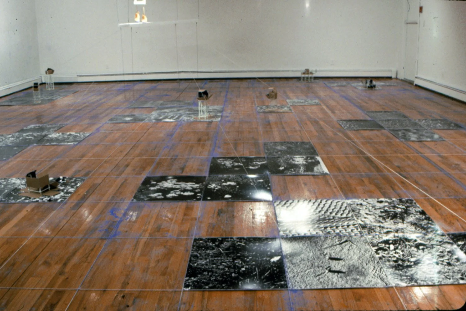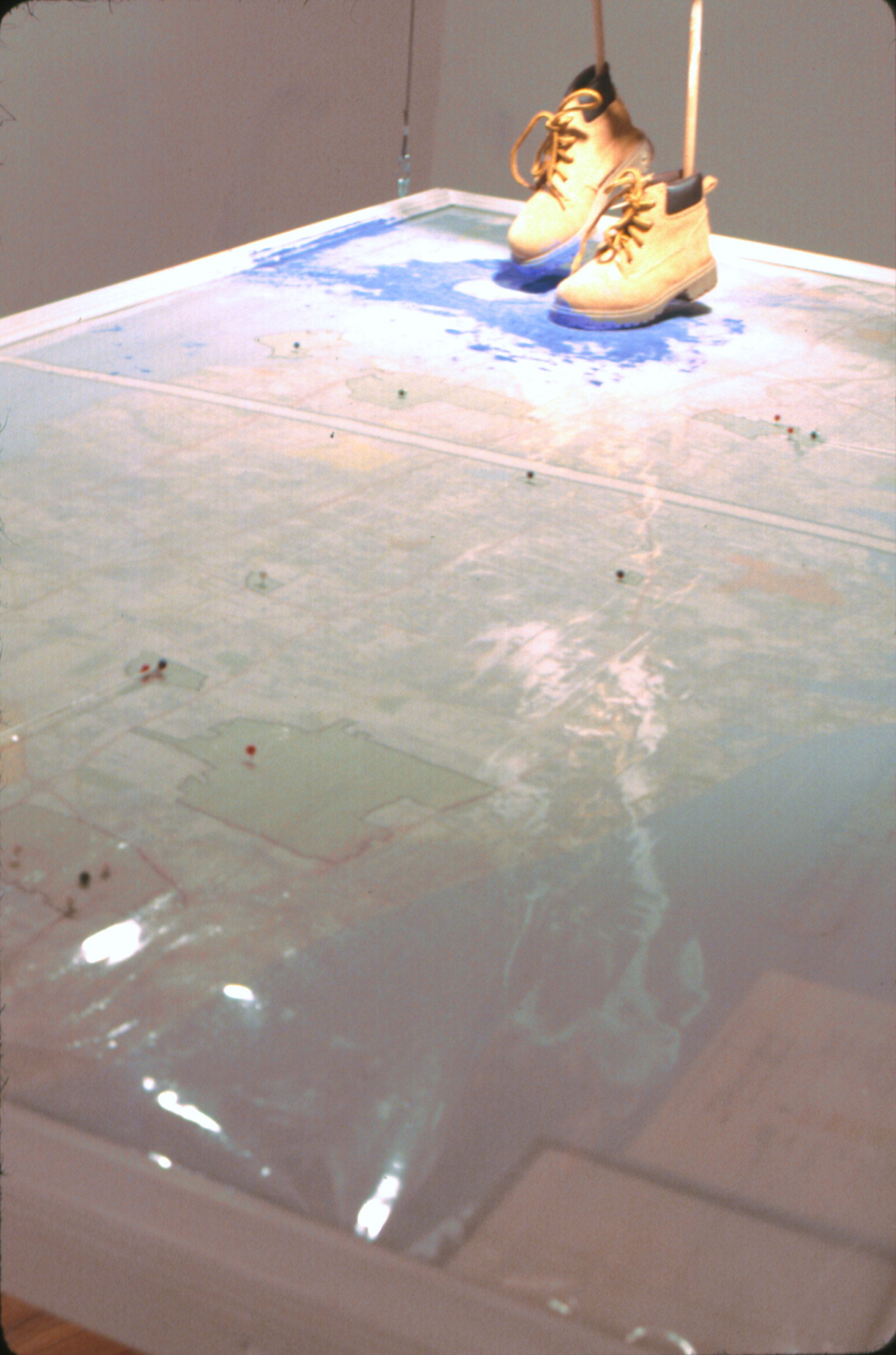 Built up wood scaffolding structures hold up a box pattern of the image on random photographs. Toward the center of the space hangs a map of the area (Long Island) where patches of green have been outlined with map tacks designating where the black and white photographs were taken. On top of the map, a pair of boots walk about, swishing in a mound of blue chalk.