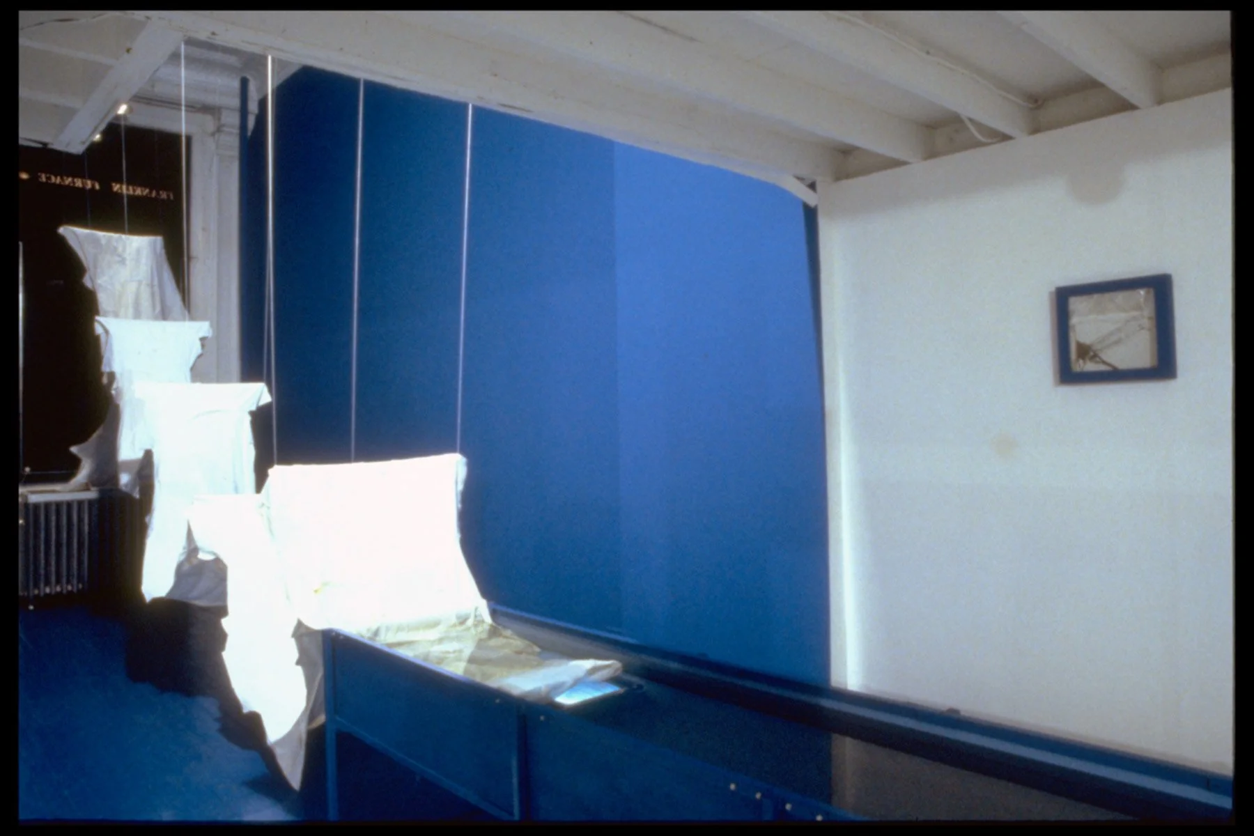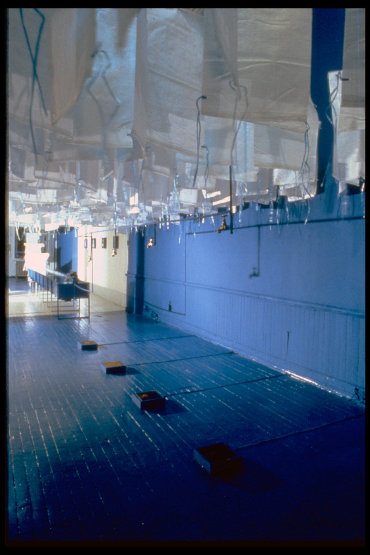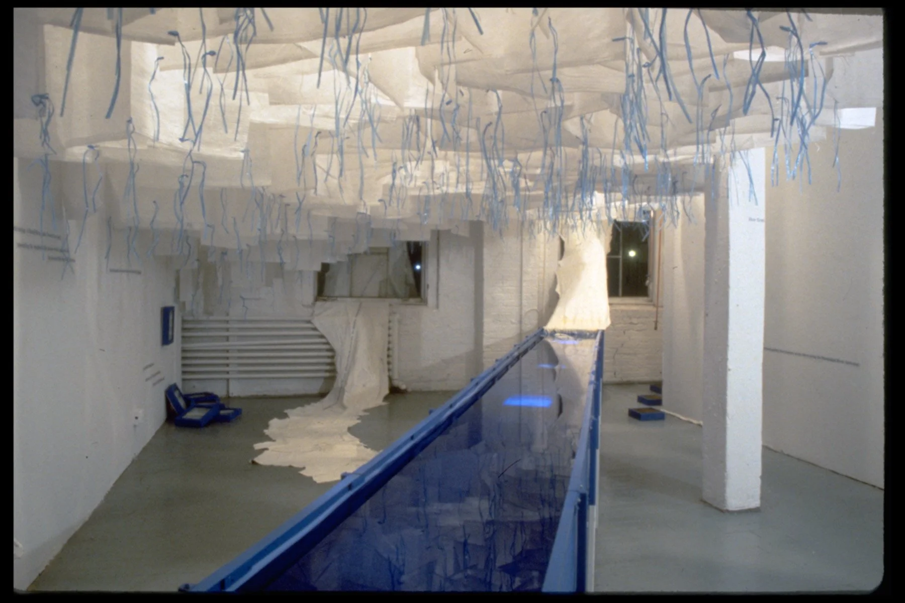 In a blue room, a flowing stream of worn white T-shirts, empties into a trough of water (24’x2’x1’), containing four monitors. Three shows a moving map of the Mississippi River, one showing the life cycles of a mosquito.