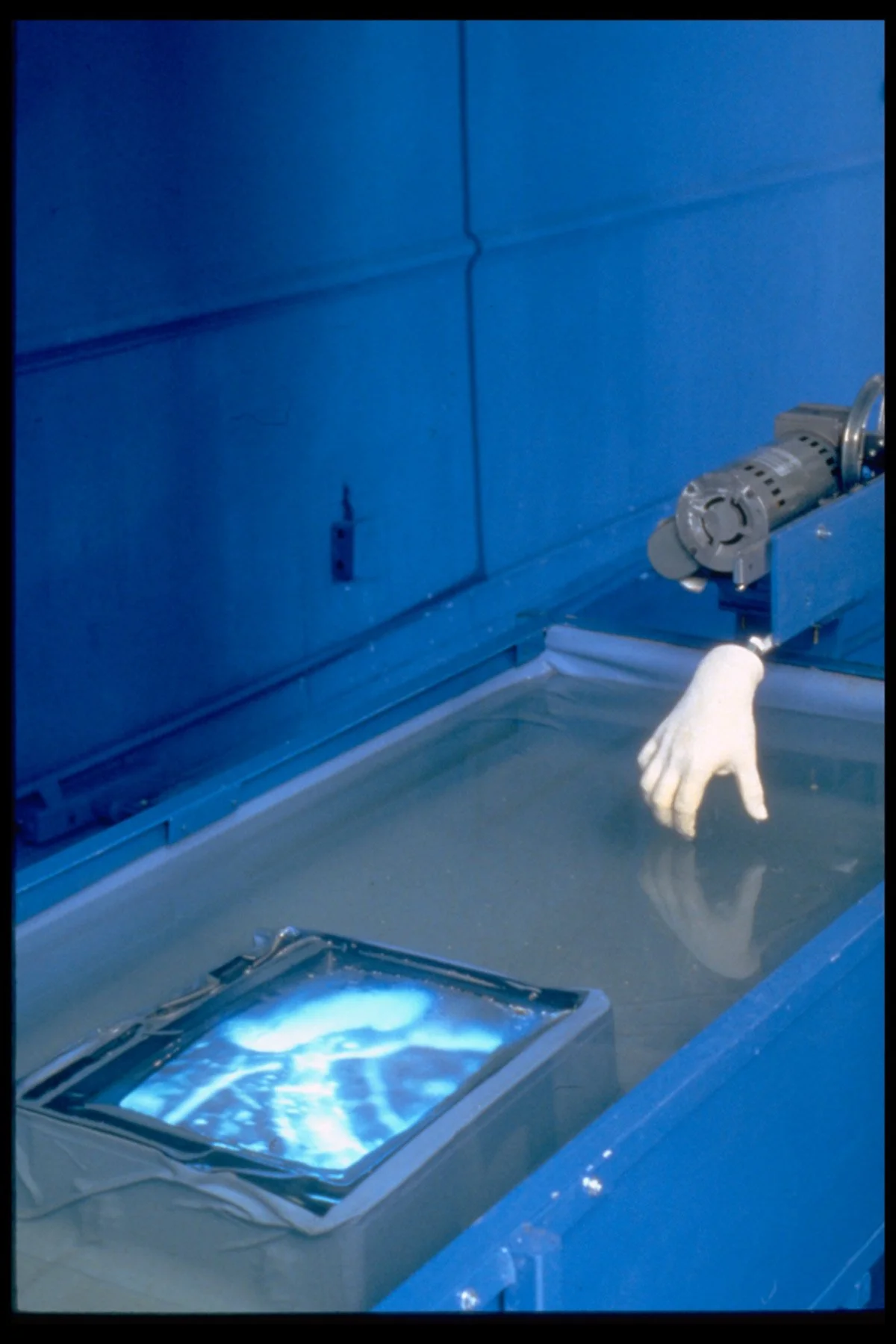 At the opposite end of the trough, a motorized hand goes off every few minutes to scratch the surface of the water, distorting the images on the screen. From the hand, four water spigots, in line drips to create steam onto four hot plates. Above the steamy atmosphere, hang empty white poly- propylene sand bags to fill the overhead space.