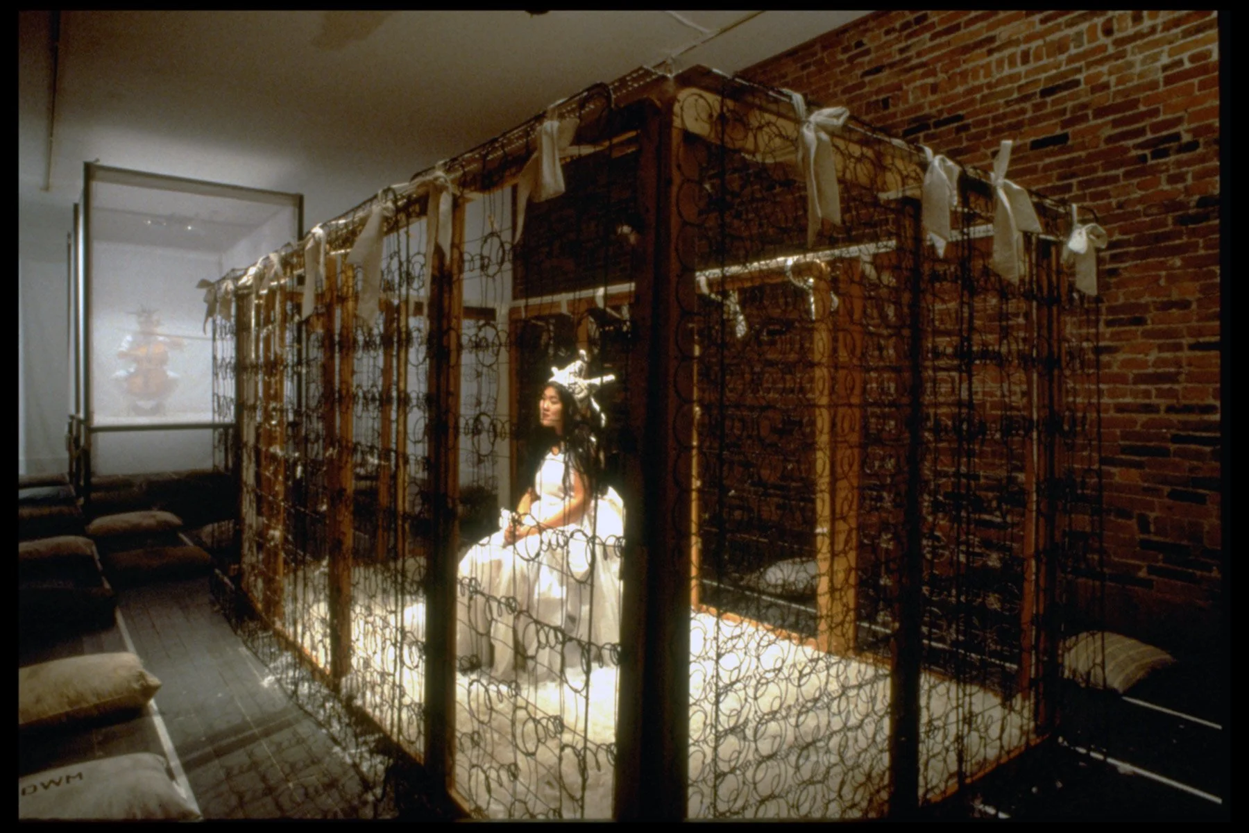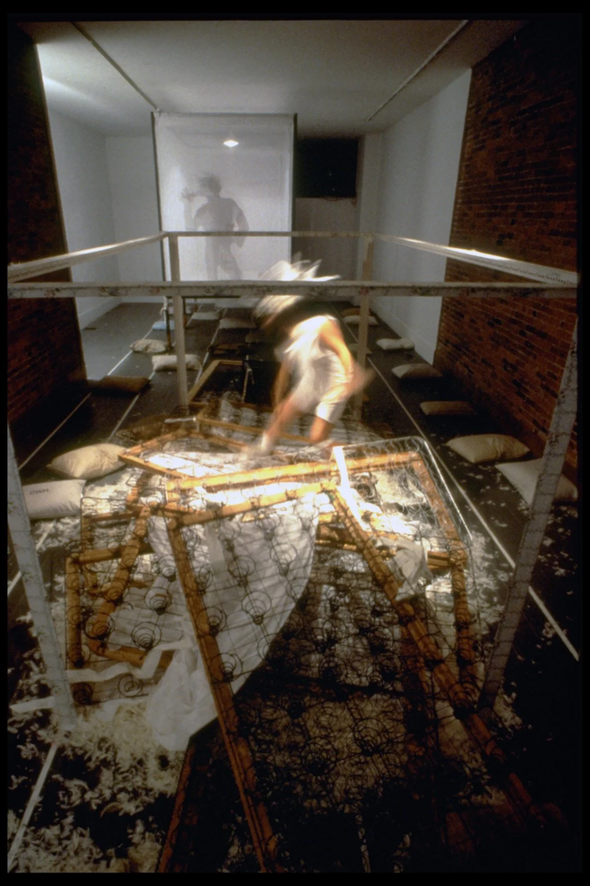 Two structures: one made of box springs, the other an over-sized canopy bed made of steel and fabric. A grid floor of feather pillows, coded with personal ad abbreviations.