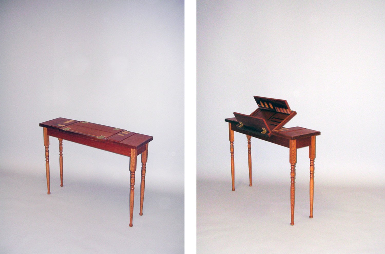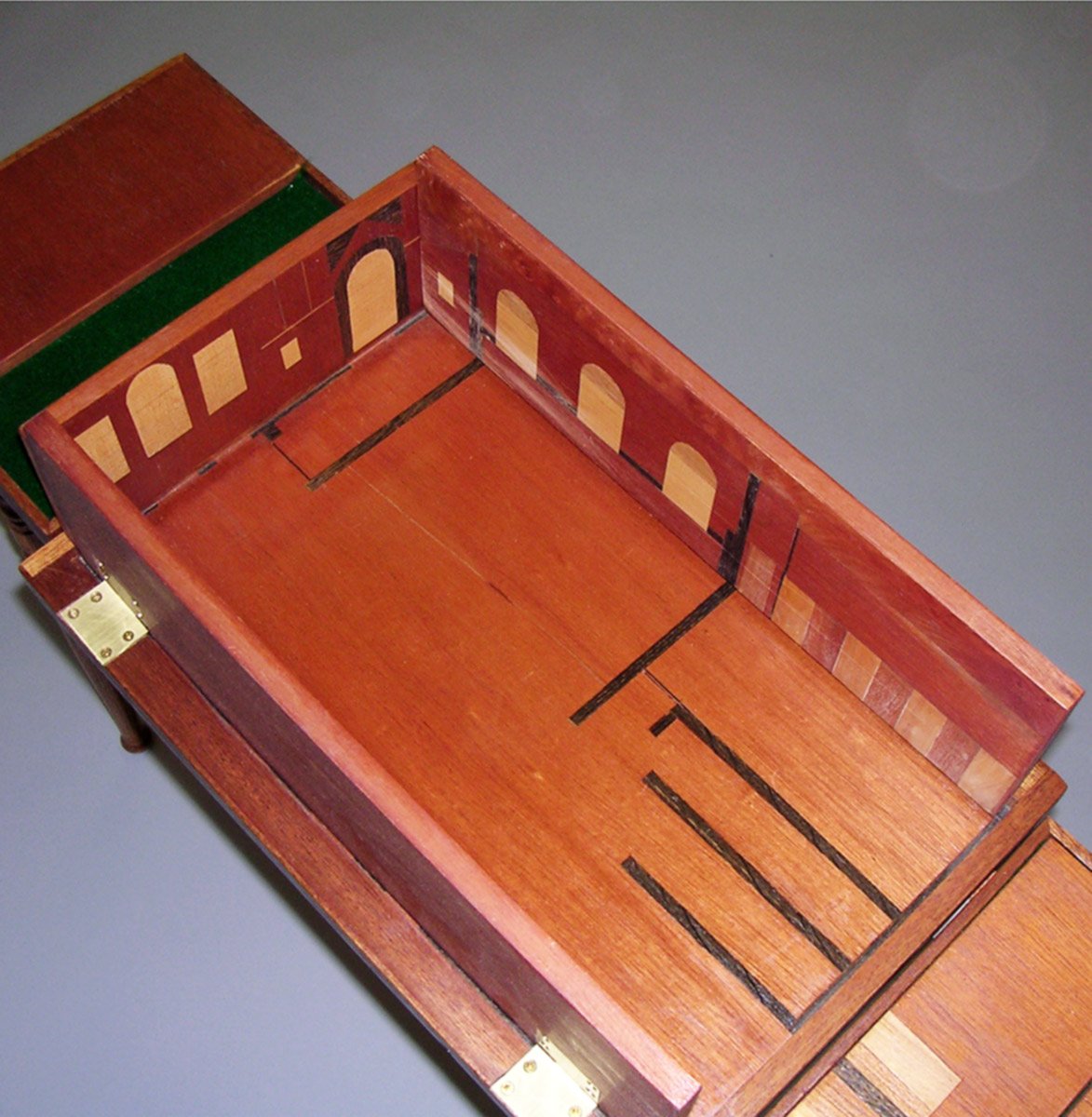 Materials: Wood, green felt, brass hardware, Wood veneers: mahogany, black bog oak, pine, birch, other exotic woods.