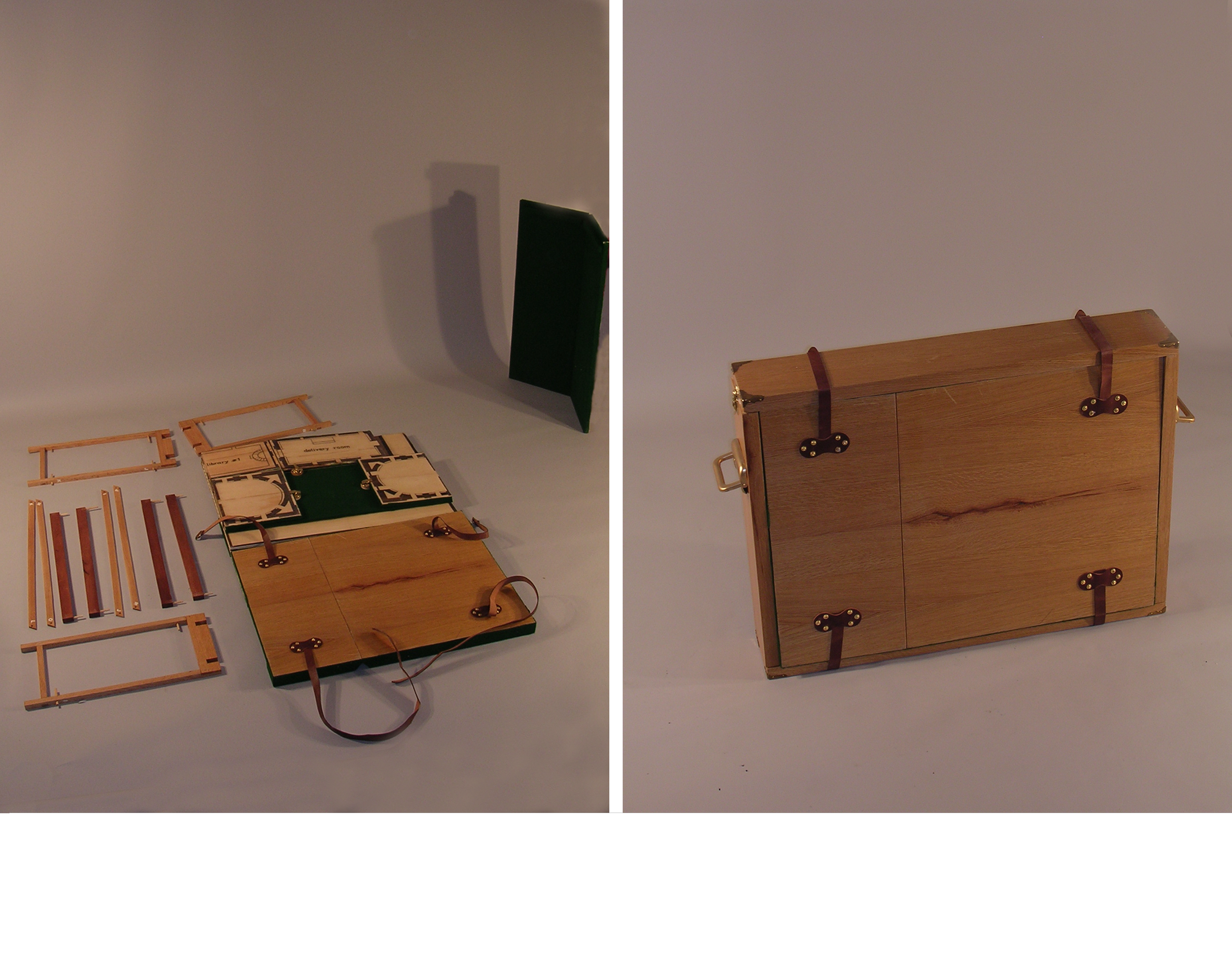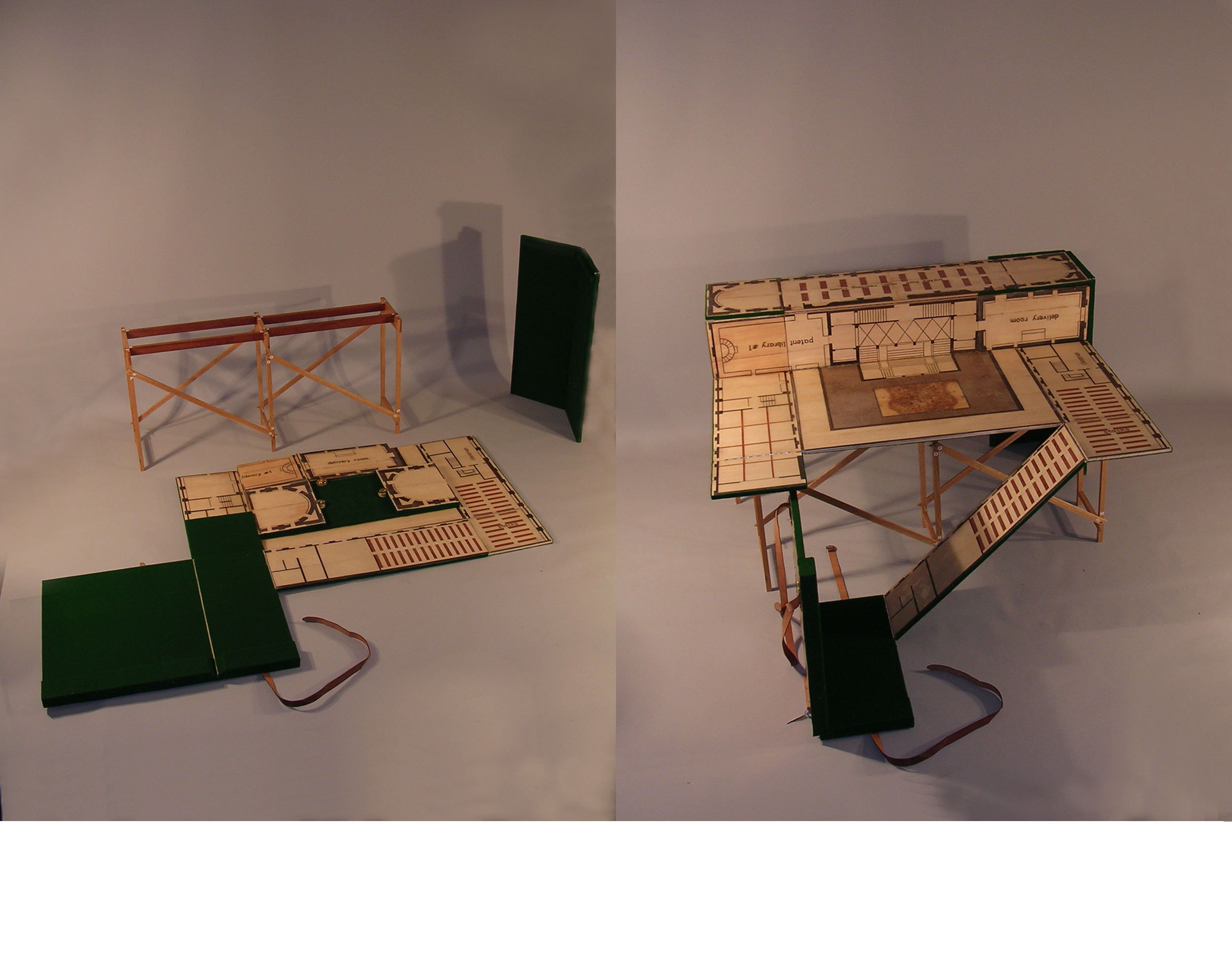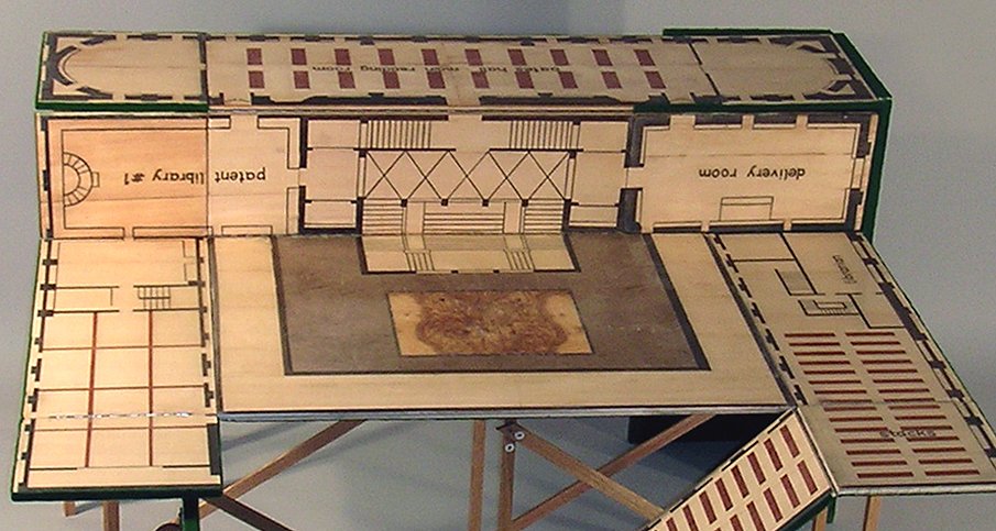 A wooden case containing a kit that opens up to become a structure showing the floor plan of the Boston Public Library.