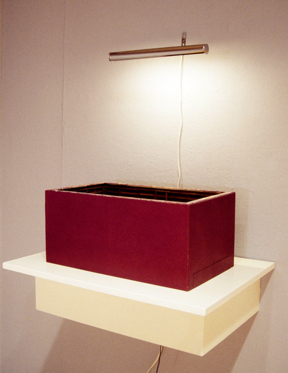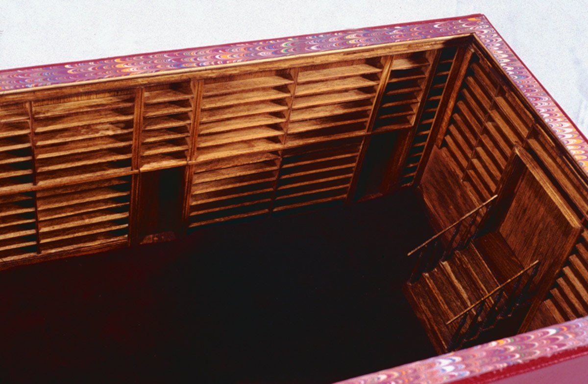 A 1/2 inch scale model of the library in the Historic McKim, Mead and White Harvard Club. The shelves are empty of books, and instead the room is filled with a sound of my voice reading a short essay on libraries and peoples relationship to books.