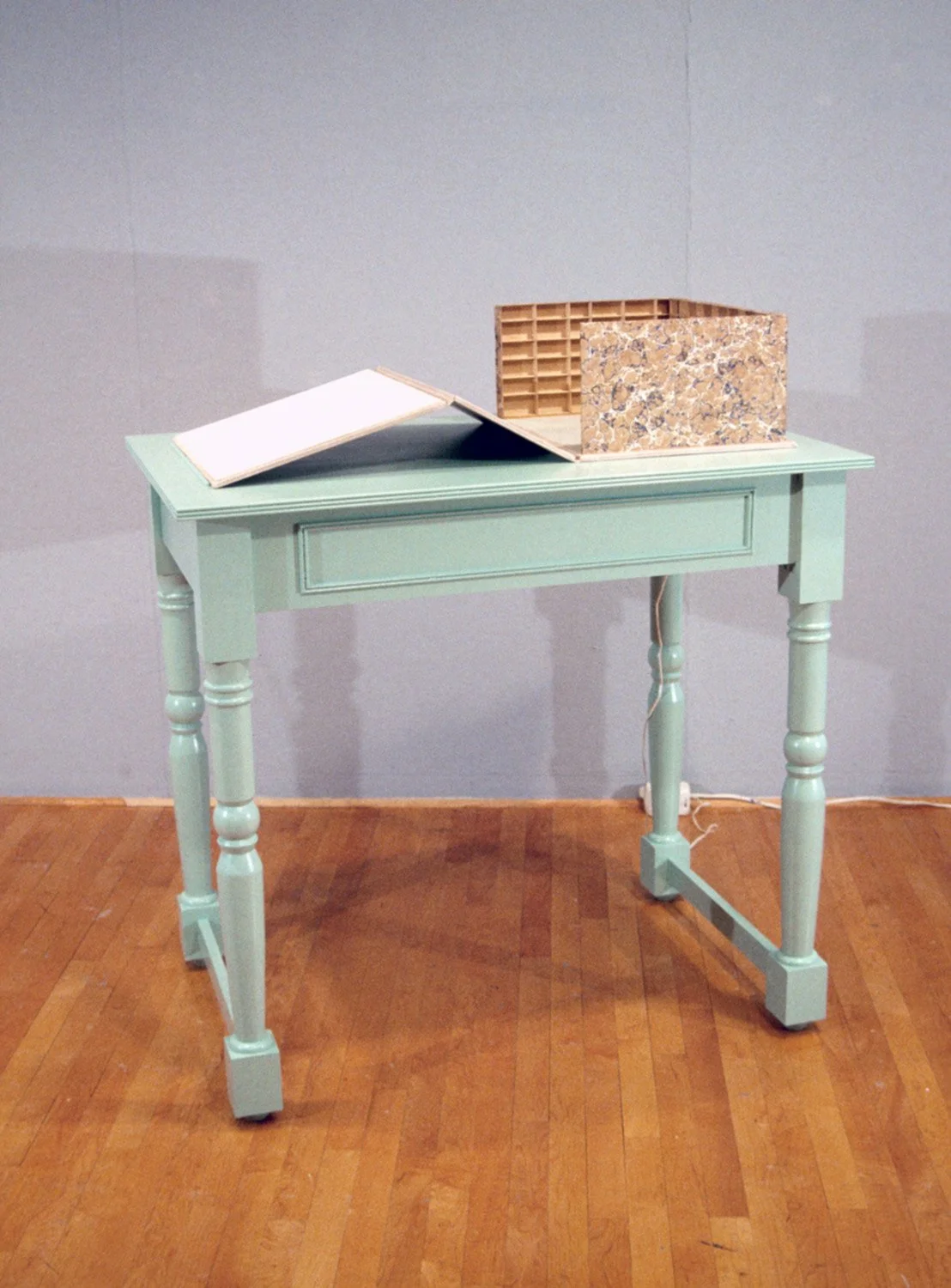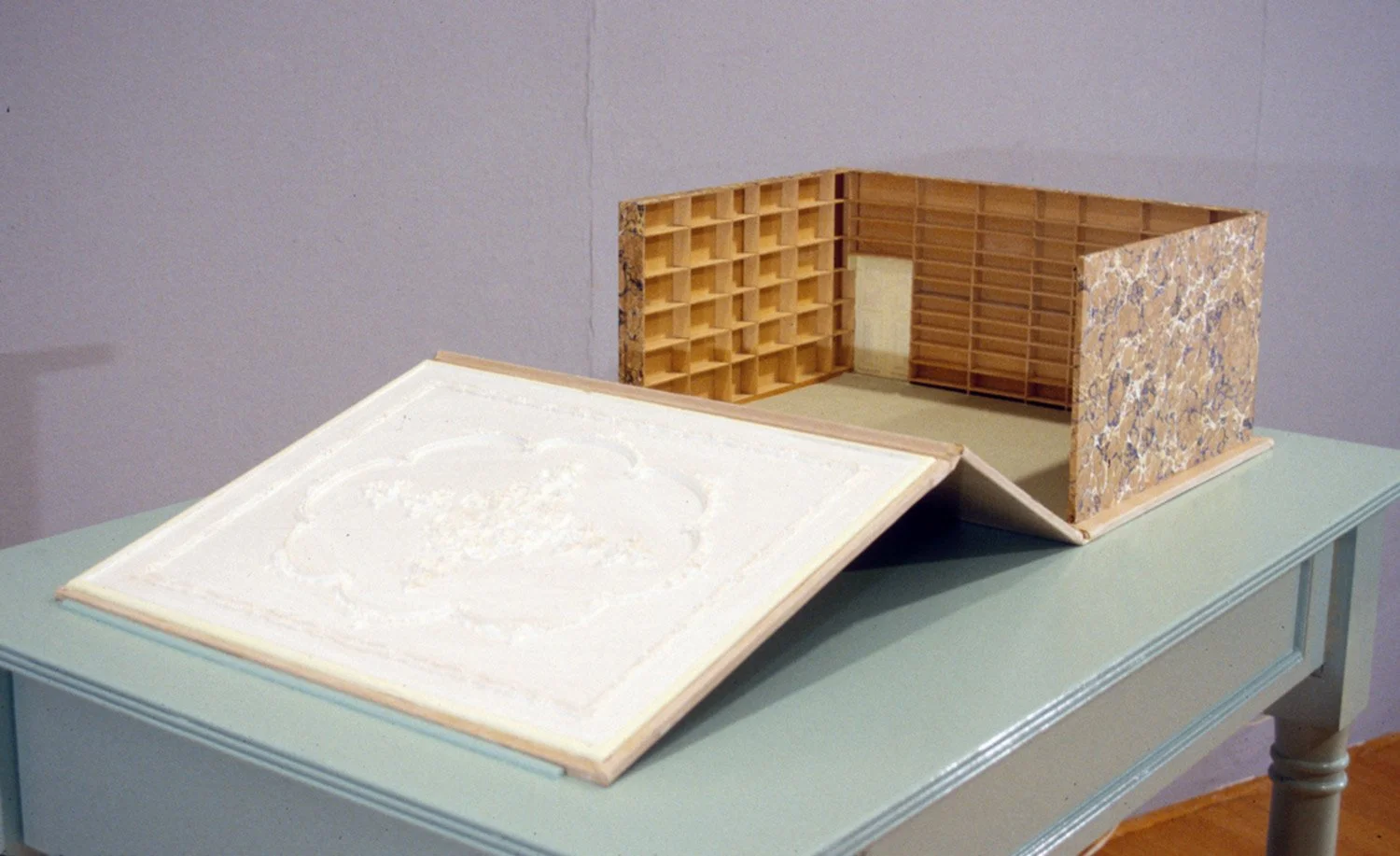 A 1/2 scale model of an imaginary library. The shelves empty of books, and recorded voices reading may different fables and children's stories are heard in the book-like box.
